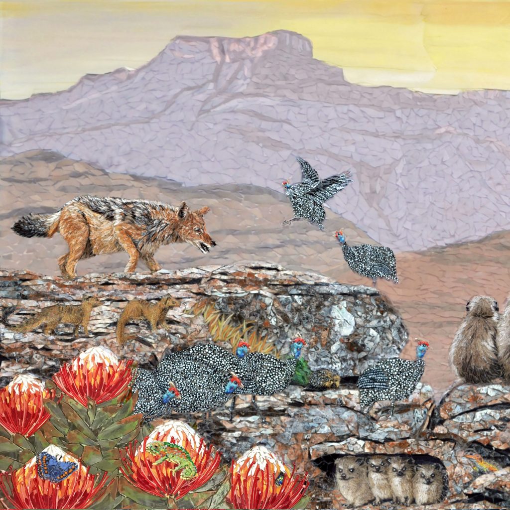 LANDSCAPES and SCENES Here are a few of the various scenes and landscapes that I've designed and completed. Title: “Sunset in the Drakensberg” Size: 700x2100 cm Price: COMMISSION (London, UK) Inspiration: CLOSE UP. This big commission has over 50 animals in it, and has the northern Drakensberg (South Africa) as the backdrop. Loved designing and creating this one... and working at this lovely big scale. Title: “Sunset in the Drakensberg” Size: 700x2100 cm Price: COMMISSION (London, UK) Inspiration: CLOSE UP. This big commission has over 50 animals in it, and has the northern Drakensberg (South Africa) as the backdrop. Loved designing and creating this one... and working at this lovely big scale. Title: “Sunset in the Drakensberg” Size: 700x2100 cm Price: COMMISSION (London, UK) Inspiration: CLOSE UP. This big commission has over 50 animals in it, and has the northern Drakensberg (South Africa) as the backdrop. Loved designing and creating this one... and working at this lovely big scale. Title: “Sunset in the Drakensberg” Size: 700x2100 cm Price: COMMISSION (London, UK) Inspiration: This big commission has over 50 animals in it, and has the northern Drakensberg (South Africa) as the backdrop. Loved designing and creating this one... and working at this lovely big scale. Title: “Sunset in the Drakensberg” Size: 700x2100 cm Price: COMMISSION (London, UK) Inspiration: CLOSE UP. This big commission has over 50 animals in it, and has the northern Drakensberg (South Africa) as the backdrop. Loved designing and creating this one... and working at this lovely big scale. Title: “Oribis and Aloes” Size: 800x1200 cm Price: COMMISSION (South Africa) Inspiration: Combining photos and ideas from the client's lovely home to create a scene with a family of oribi in the grasslands with the bright orange-red aloes, and beautiful Midmar dam as the backdrop. Title: “Early Morning Forest Walk” Size: 40 x 50 cm Price: COMMISSION (South Africa) Inspiration: In this commission I tried to capture the early morning light that filters through the trees in our local forest and catches the moisture, creating the most magical mist and shafts of light. Whenever I walk in these forests I always think of the famous quote by John Muir, "And into the woods I go, to lose my mind and find my soul". Title: “Blue Horizon Bay” Size: 50 x 80 cm Price: COMMISSION (South Africa) Inspiration: I so loved designing and creating this scene from the client’s photos of the striking strandveld in the Cape... incorporating the unique fynbos vegetation... and a few bright sunbirds and a woodland kingfisher... all overlooking the beautiful bright blue Indian Ocean. So lucky to live with this incredible view! Title: “Northern Lights” Size: 60 x 120 cm Price: COMMISSION (South Africa) Inspiration: This commission of the northern lights (aurora borealis) threw me far out of my comfort zone! I really wanted to try capture the wispy and almost ethereal feel of this spectacular light display... To try do this I melted layers of glass and glazes to create the sky, as well as the reflections in the water. The snow-capped mountains are mosaic. Title: “Tickling the Giant” Size: 45 x 120 cm Price: SOLD (South Africa) Inspiration: A typical autumn scene – wild fields of the beautiful flowers in the central Drakensberg. Each and every flower, bud and stem is individually handmade in glass. The background mountain range is Giant’s Castle. Title: “Breakfast in the Berg” Size: 65 x 185 cm Price: SOLD (South Africa) Inspiration: A pair of Malachite Sunbirds feeding on the local and endemic Protea caffra in the northern Drakensberg. The background peaks of the Drakensberg show the peaks of the incredible and dramatic Amphitheatre. Title: “Panaromic Red Poker Feast” Size: 85 x 115 cm Price: SOLD (South Africa) Inspiration: A typical winter scene in the central Drakensberg – five Southern Double-collared Sunbirds feeding on the bright orange red pokers. Background peaks of the Drakensberg include (from left to right) the Inner Horn, Outer Horn, The Bell and Cathedral Peak.